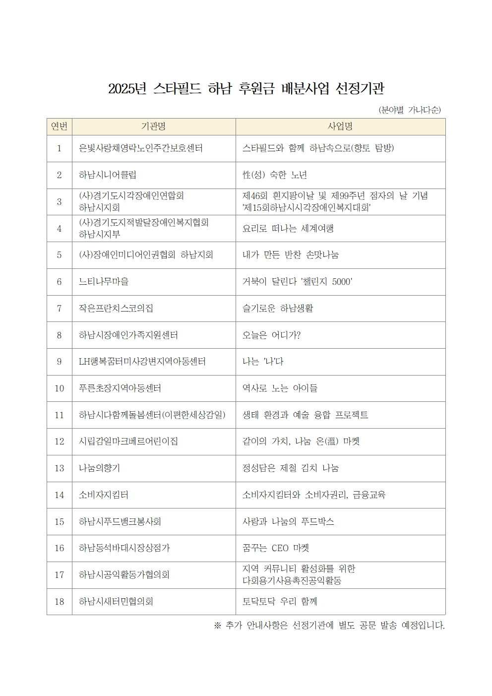| 2025년 스타필드하남 후원금 배분사업 선정기관 알림 및 후원처 로고파일 | |||||