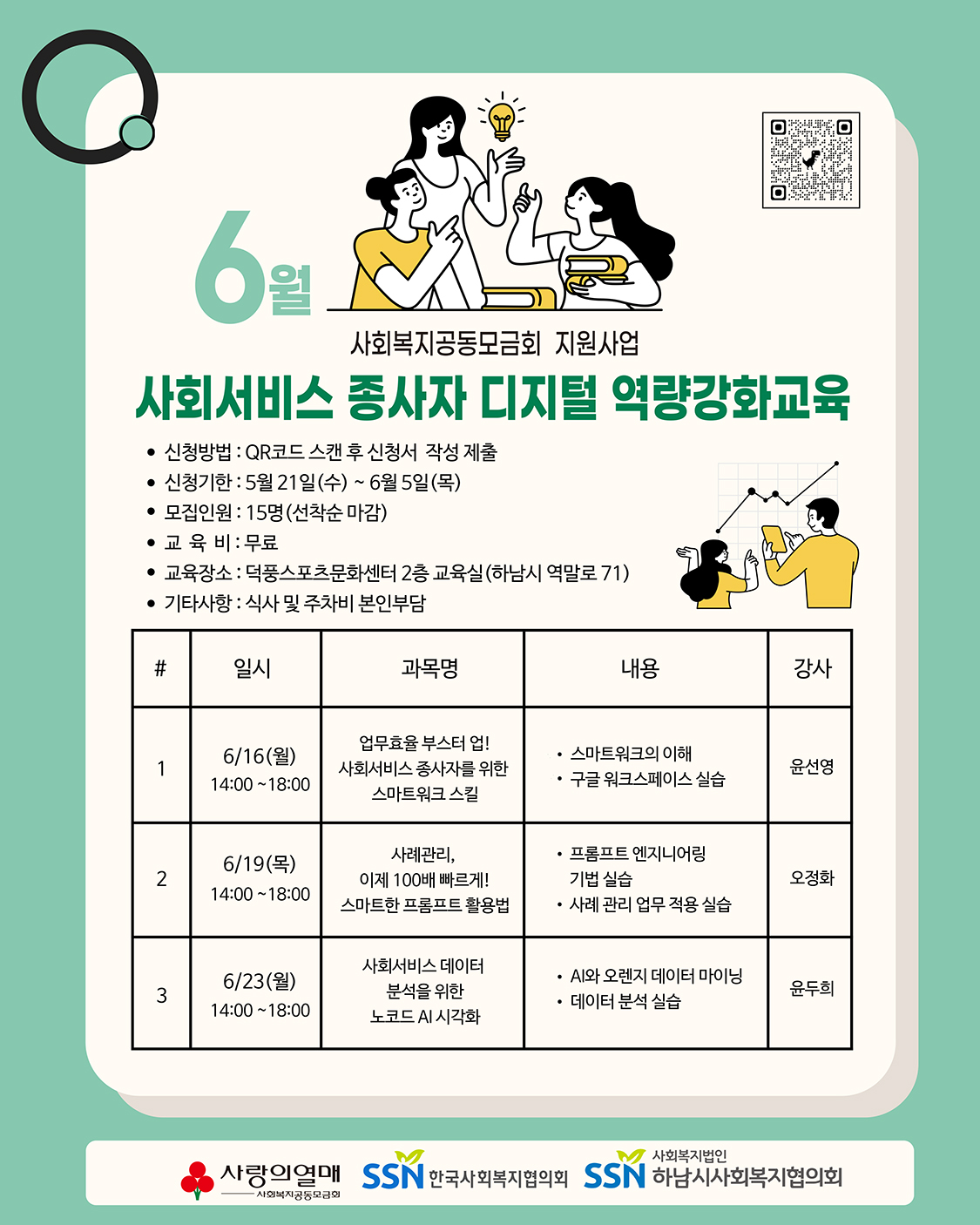 | 사회복지공동모금회 지원사업 <사회서비스종사자 디지털역량강화교육> 6월 교육 안내 | |||||