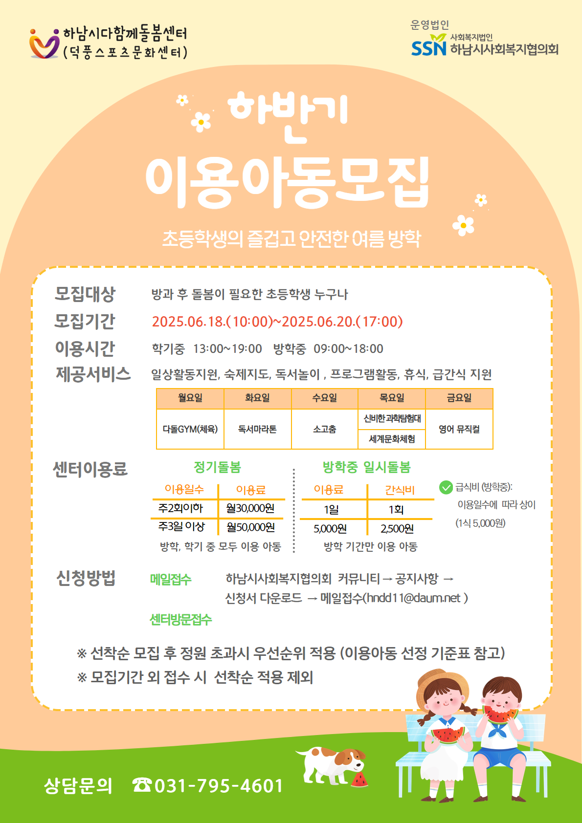 | 하남시다함께돌봄센터(덕풍스포츠문화센터) 하반기 이용아동 모집요강 | |||||