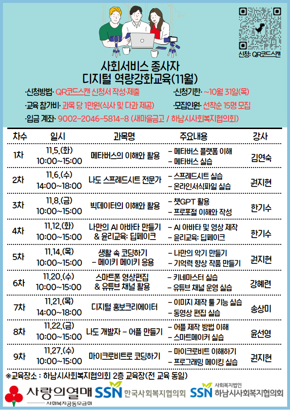 사회복지공동모금회 지원사업 <사회서비스종사자 디지털역량강화교육> 11월 교육 안내