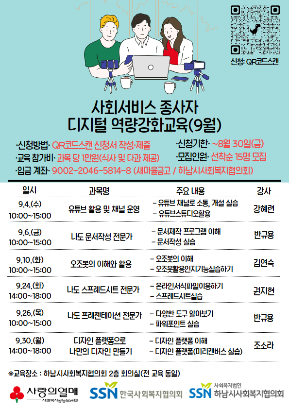 사회복지공동모금회 지원사업 <사회서비스종사자 디지털역량강화교육> 9월 교육 안내