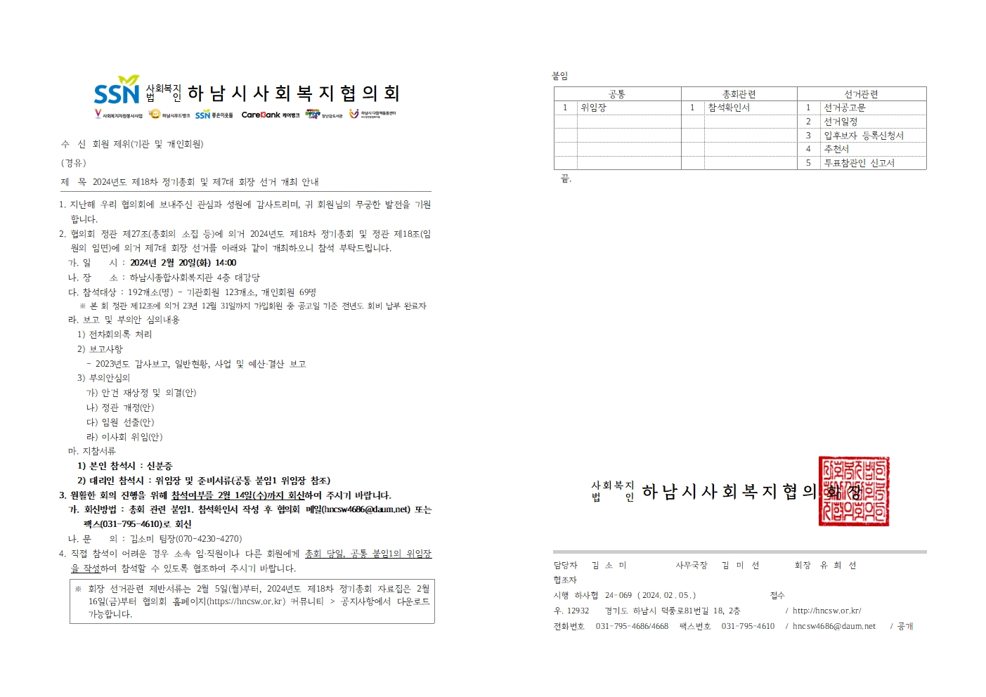 | 첨부파일 | [공문] 2024년도 제18차 정기총회 개최 및 제7대 회장 선거 개최 안내.pdf [공통 붙임1] 위임장.hwp [총회관련 붙임1] 총회 참석확인서.hwp | ||||