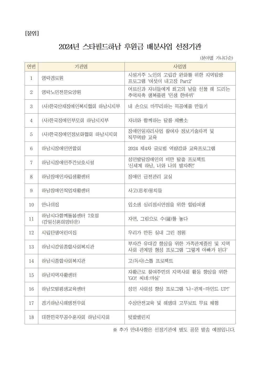 | 2024년 스타필드하남 후원금 배분사업 선정기관 알림 및 후원처 로고파일 | |||||