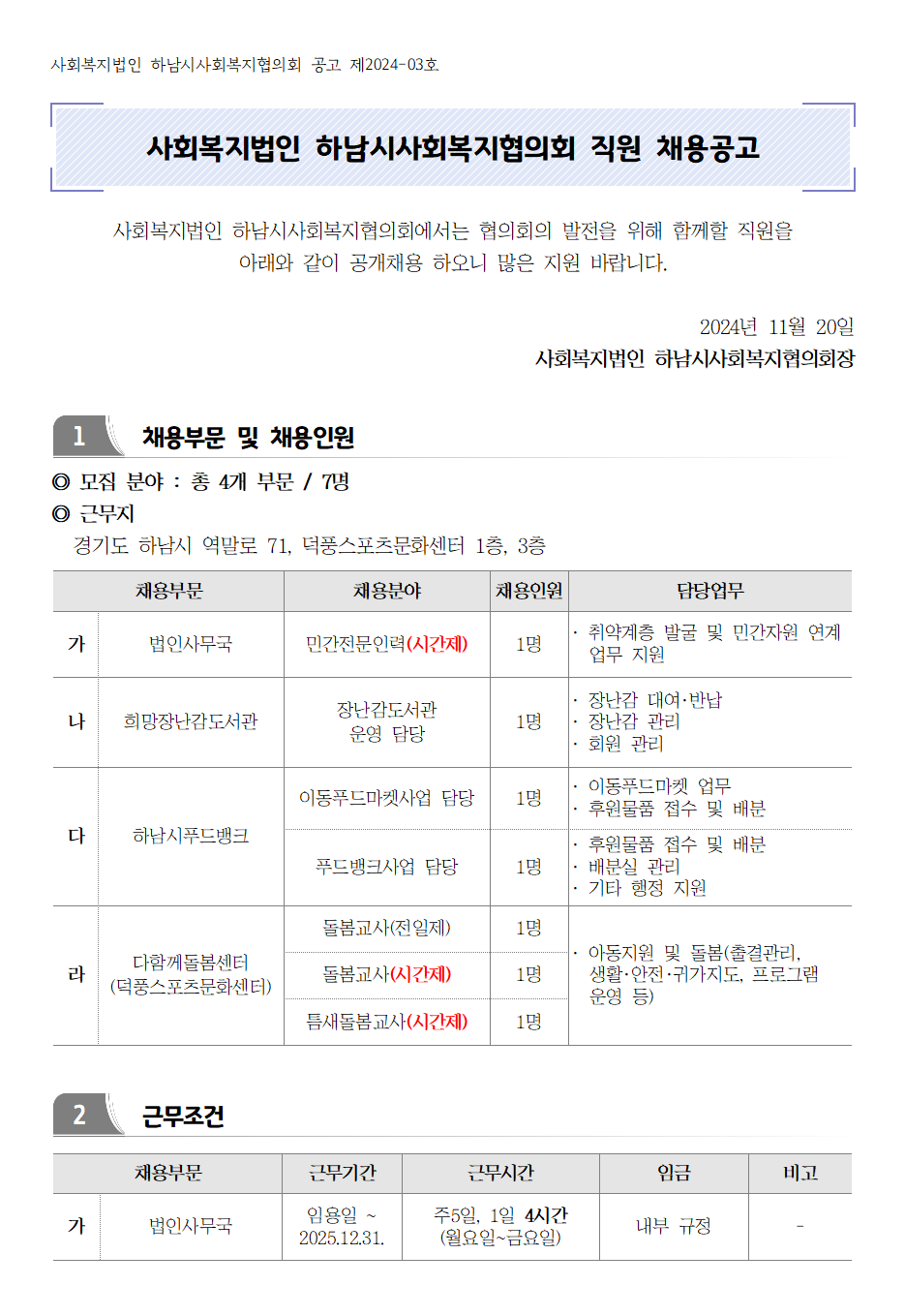 | 채용공고 제2024-03호 「법인 사무국, 장난감도서관, 푸드뱅크, 다함께돌봄센터 직원 채용」 | |||||