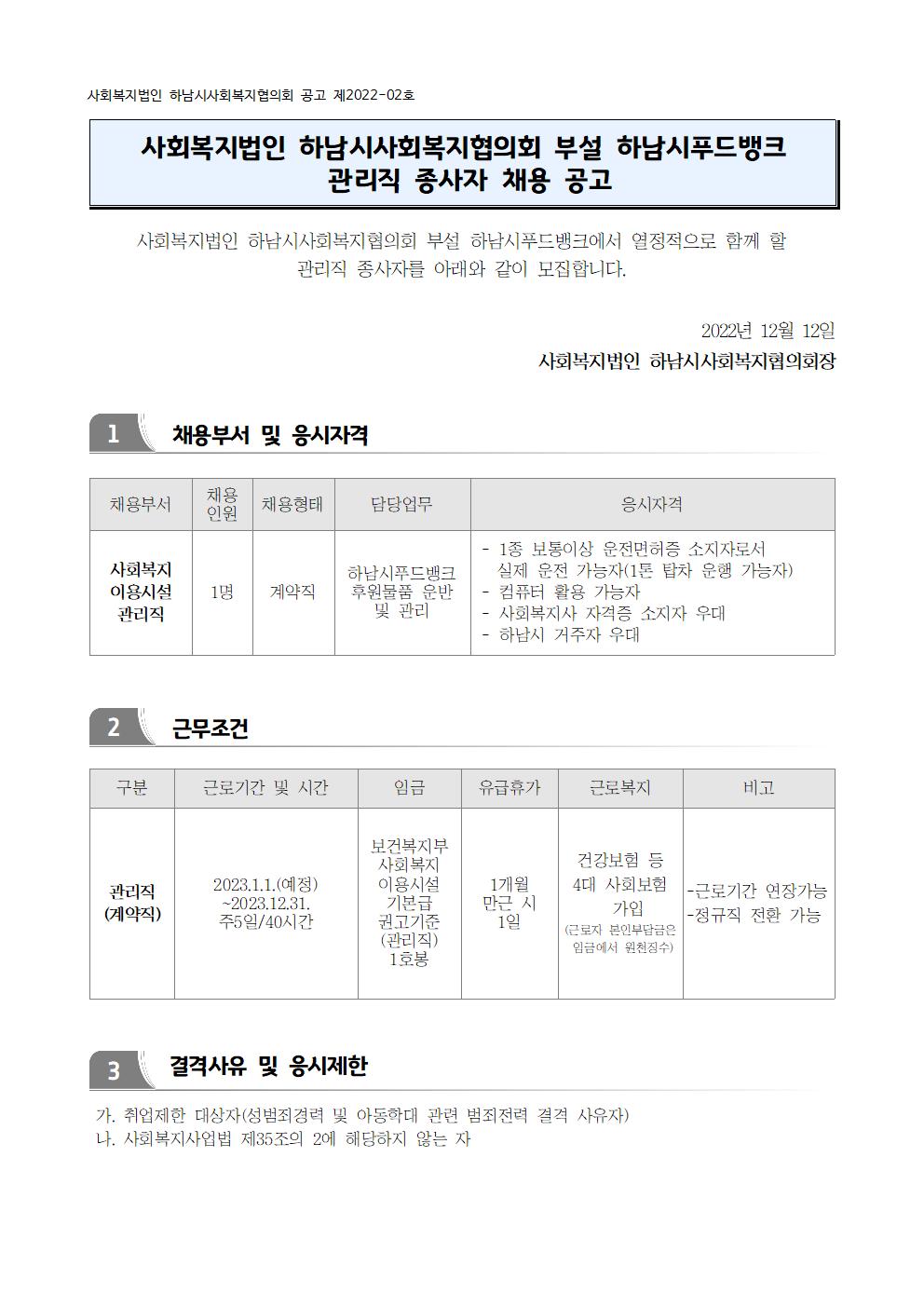 | 채용공고 제2022-02호 「하남시푸드뱅크 관리직 채용」 | |||||