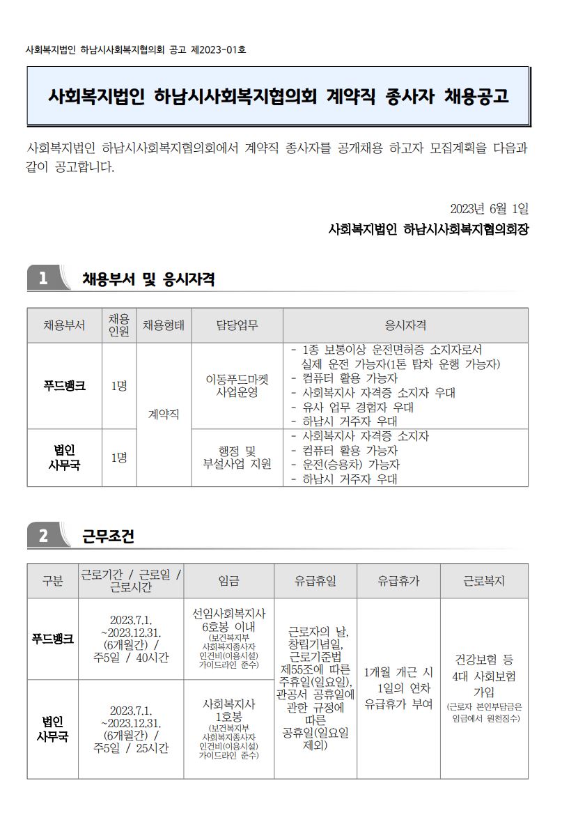 | 채용공고 제2023-01호 「법인 사무국 시간제근로자 및 푸드뱅크 이동푸드마켓 담당 채용」 | |||||