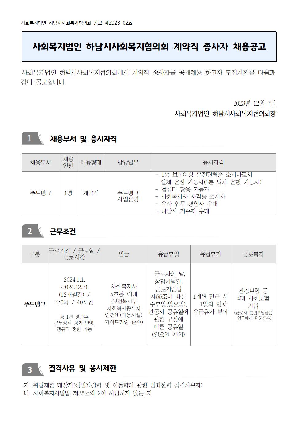 | 채용공고 제2023-02호 「푸드뱅크 사업운영 사회복지사 채용」 | |||||