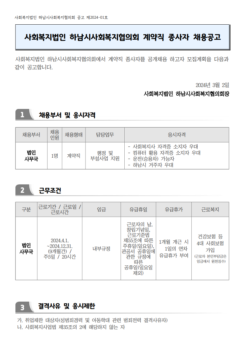 | 채용공고 제2024-01호 「법인 사무국 시간제근로자 채용」 | |||||