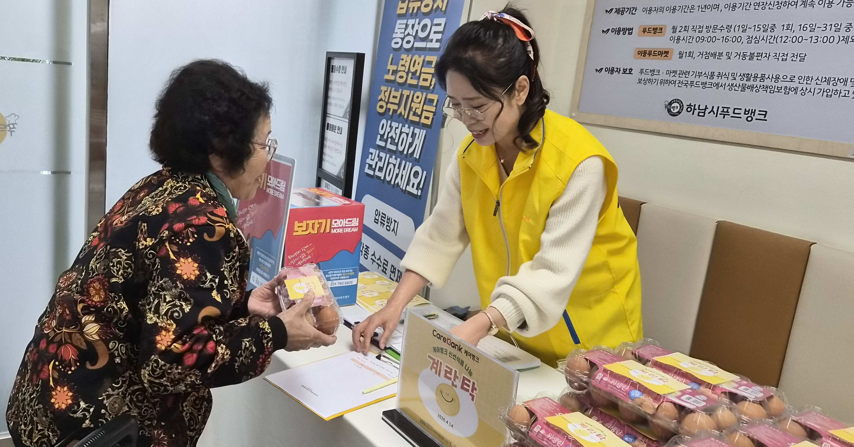 일 자: 2026년 4월 14일 (화) 장 소: 하남시사회복지협의회 부설 푸드뱅크 참석자: 케어뱅크 돌봄봉사자, 돌봄대상자 내 용: 케어뱅크는 돌봄이 필요한 65세 이상 어르신에게 돌봄활동을 제공하는 사업으로 신선식품 나눔으로 [계란 탁] 전달 활동과 돌봄대상자 발굴및 홍보캠페인을 진행하였습니다. |