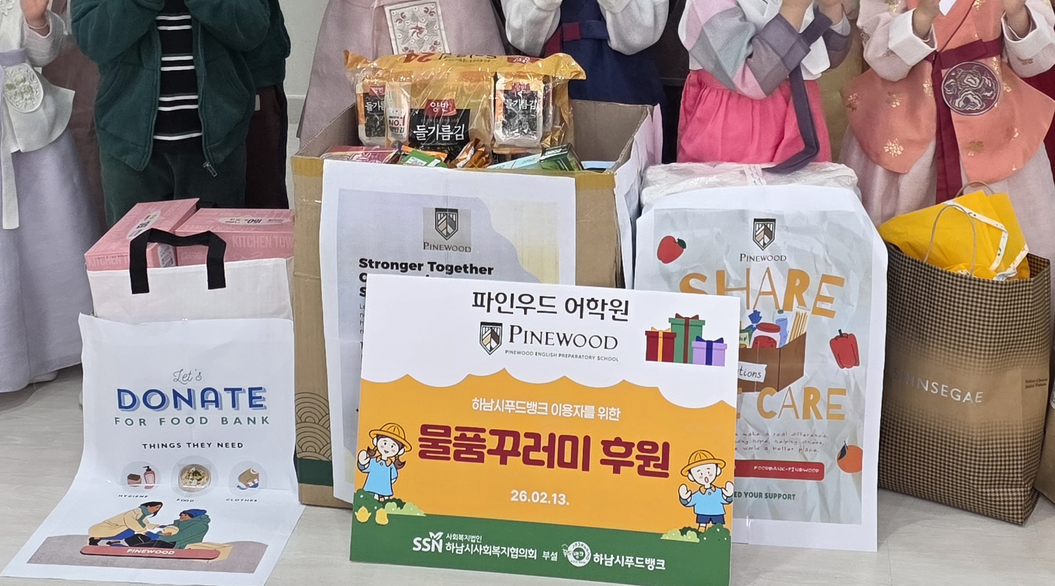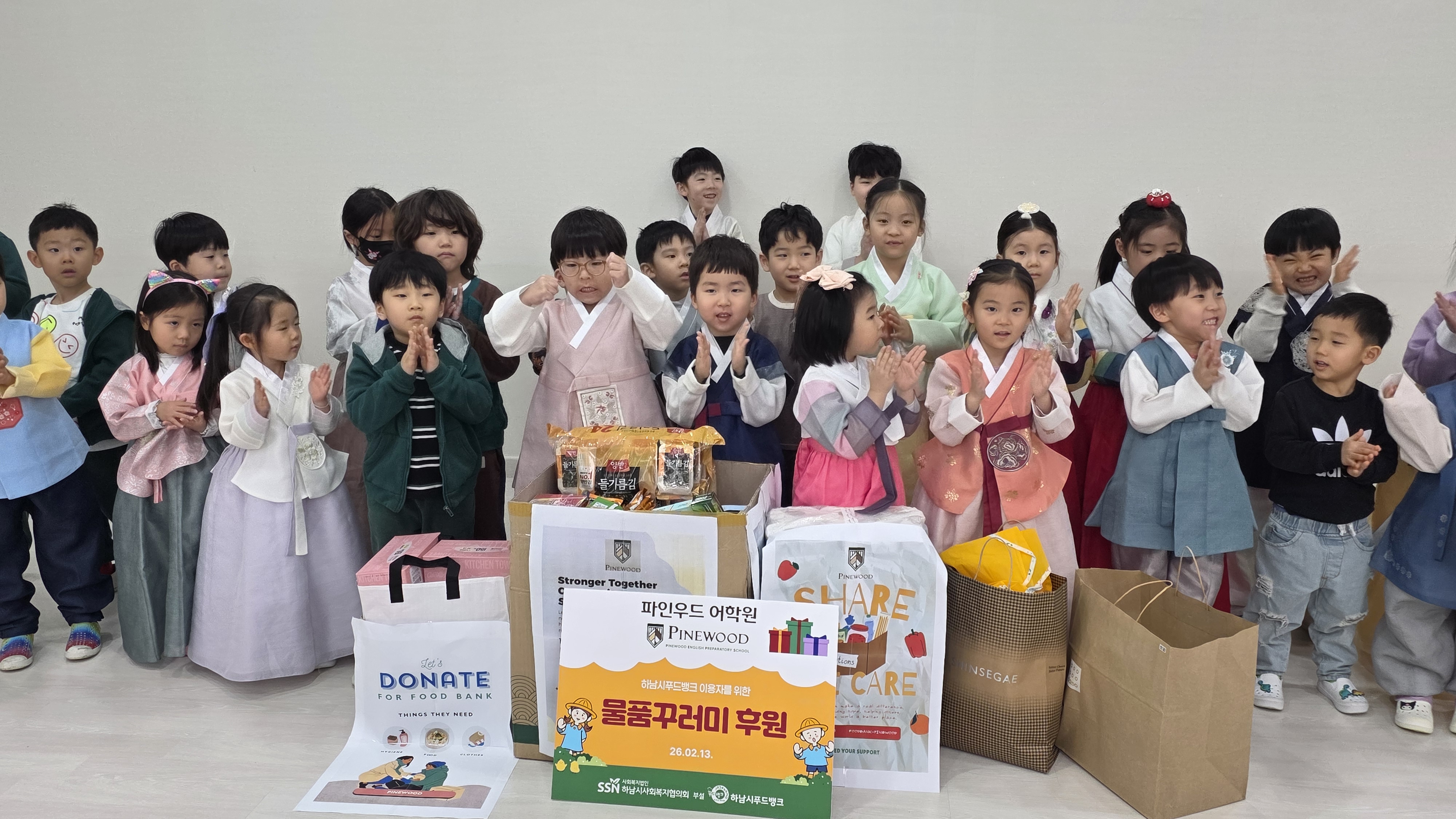 일 자: 2026년 2월 13일 (금) 장 소: 파인우드어학원 참석자: 파인우드어학원 원아들 및 교사, 원장님 행사명: 파인우드어학원 푸드뱅크 이용자들을 위한 물품꾸러미 전달식 내 용: 파인우드어학원 원아들이 설 명절을 맞아 푸드뱅크 이용자들을 위해 식료품나눔을 진행하였습니다.