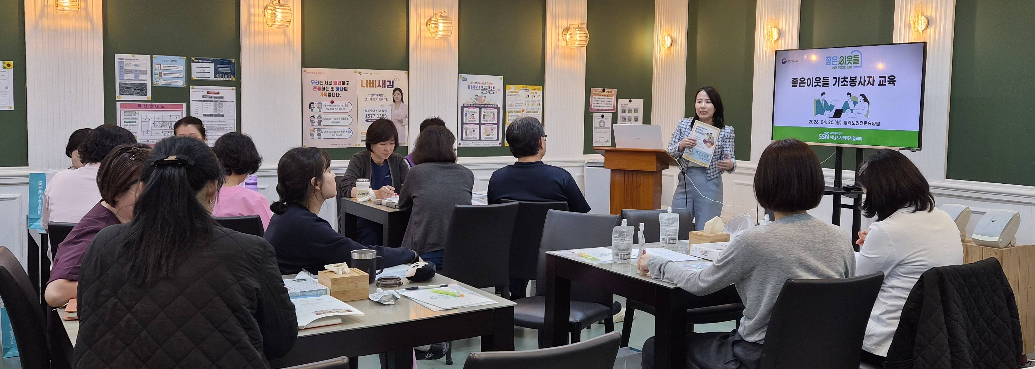 일 시: 2026년 4월 20일 (월) 장 소: 영락노인전문요양원 참석자:30여명 내 용: 복지소외계층 발굴 및 민간자원 연계ㆍ지원 사업인 좋은이웃들 2026년 4차 봉사자 기초교육을 진행하였습니다. |
