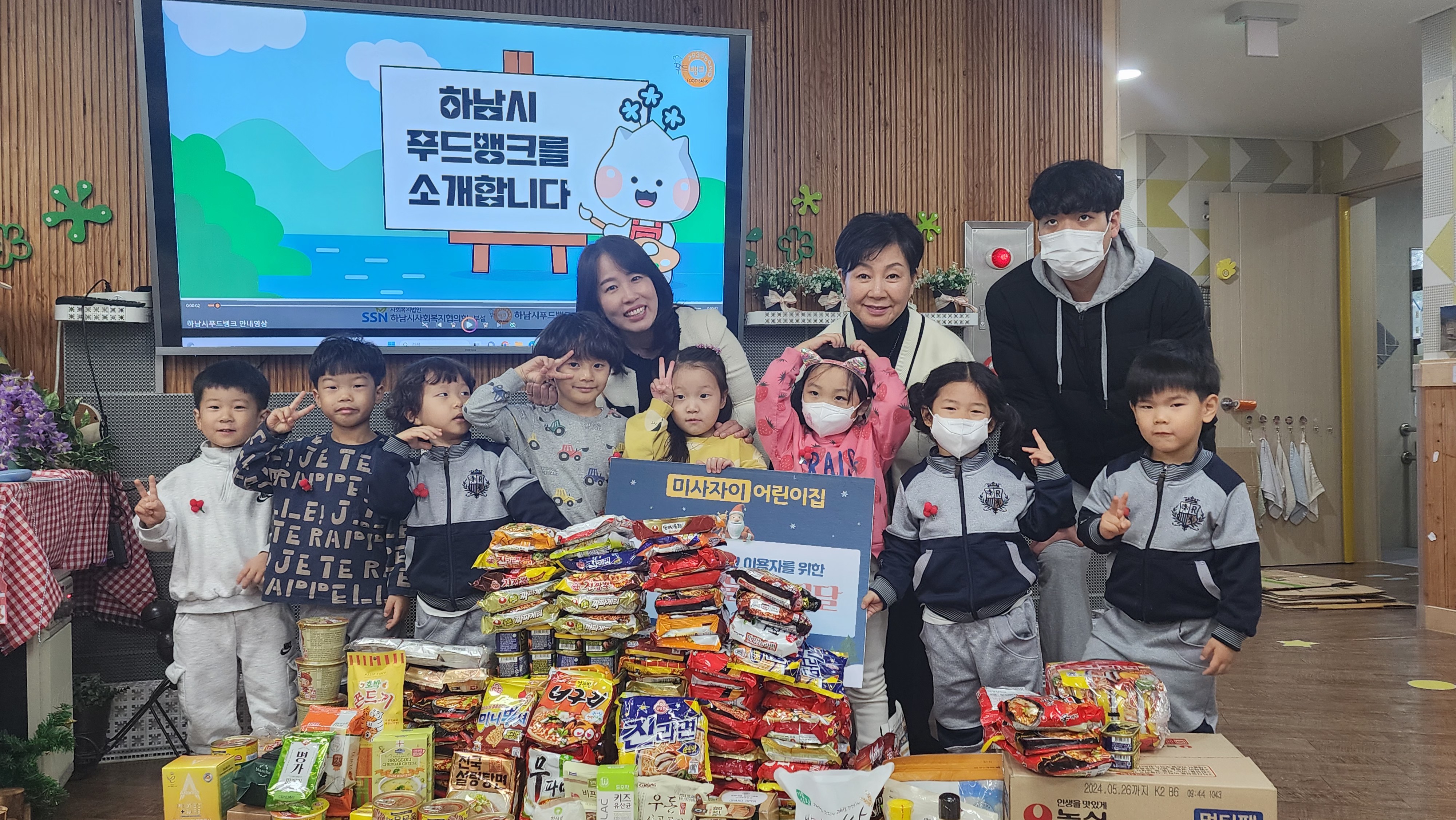 미사자이어린이집 원아들과 선생님들이 푸드뱅크 이용자를 위해 정성스럽게 모은 물품 전달식을 진행했습니다.