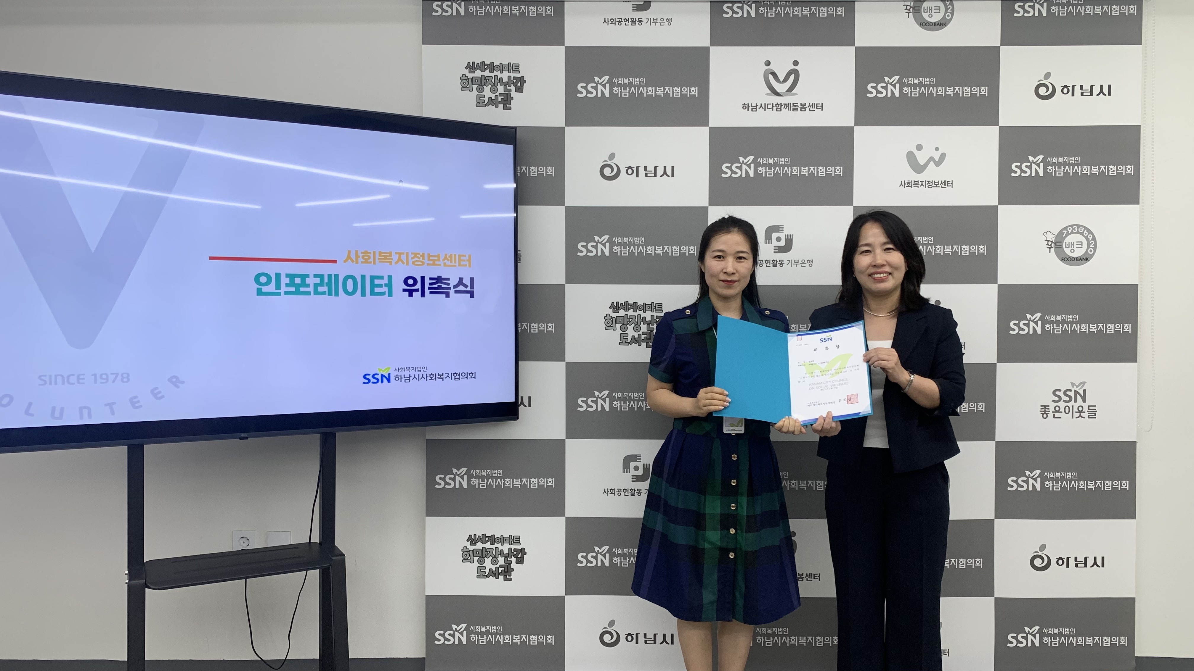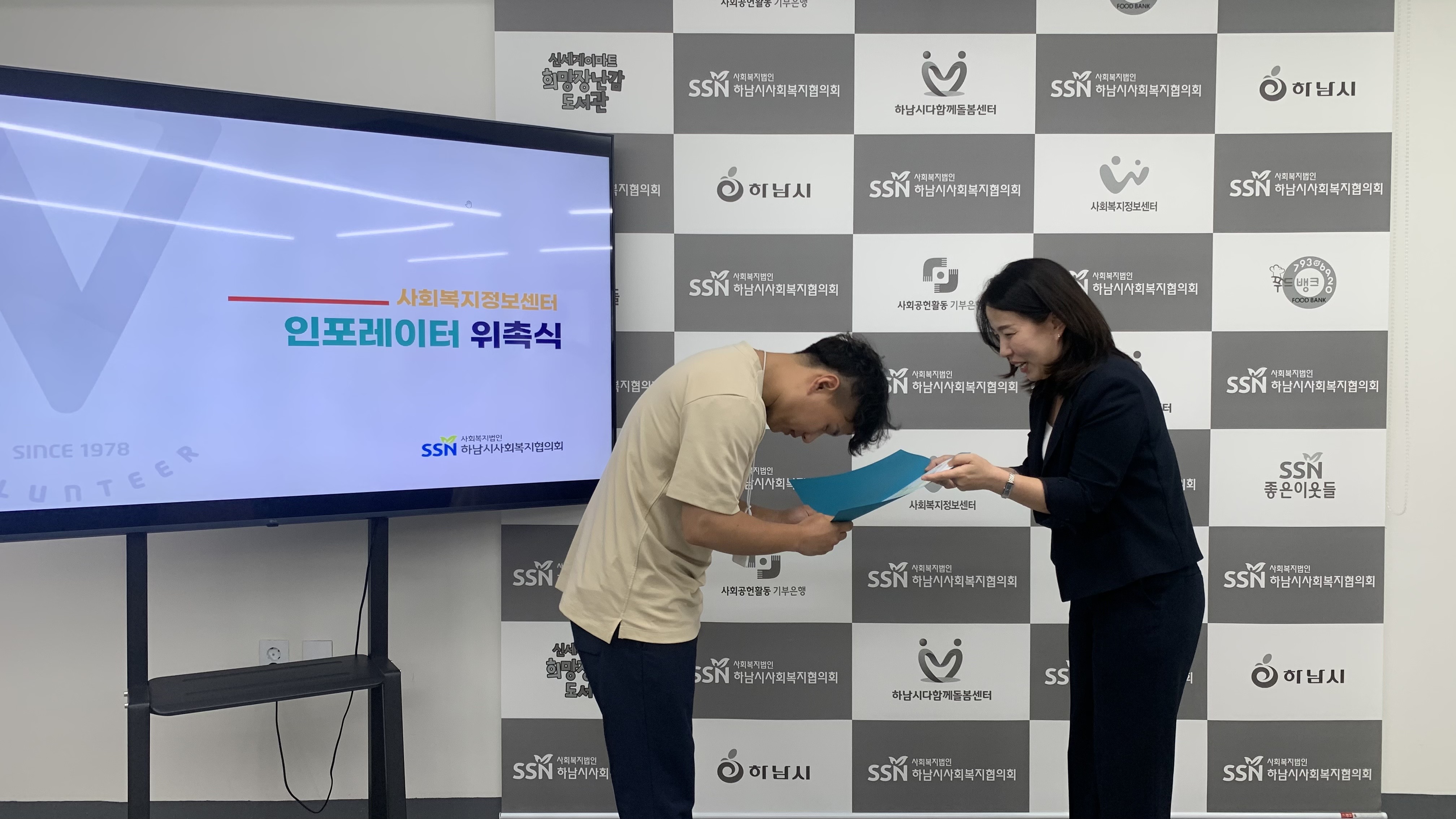 2023.7.3.(월) 하남시의 다양한 사회복지 정보를 하나의 통합시스템으로 제공하는 '사회복지정보센터(welinfo)' 구축에 대한 배경과 의미, 정보 업로드 방법 등에 대해 교육하는 시간을 갖고, 활성화를 위하여 정보 입력 및 관리를 위한 전문자원봉사자 '인포레이터' 위촉식을 진행하였습니다. |