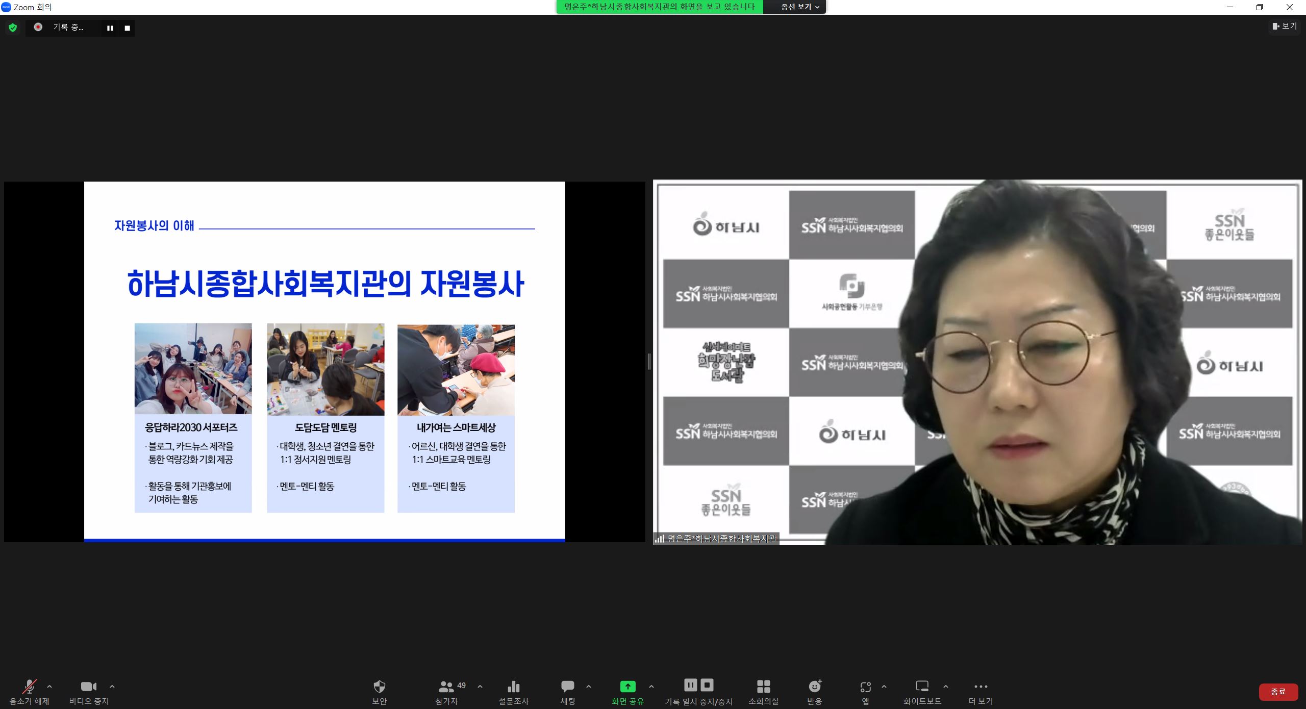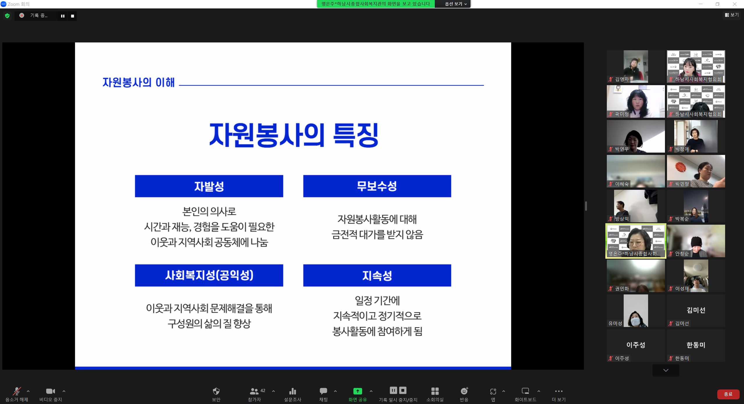 하남시종합사회복지관 명은주 관장님과 함께 자원봉사에 대해 알아보는 시간을 갖고 수료식을 진행하였습니다.