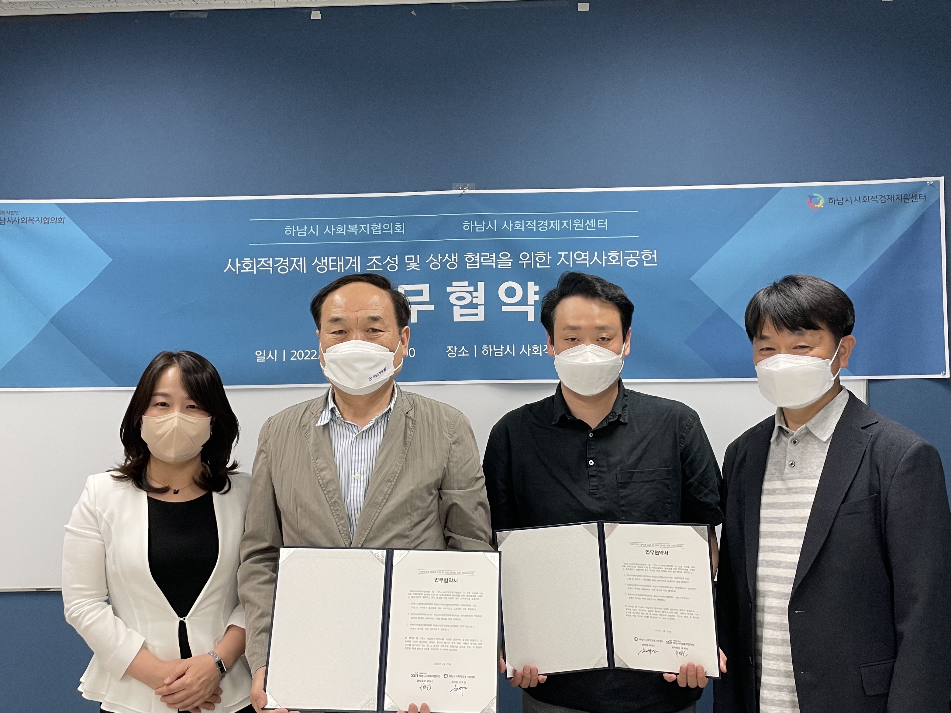 2022.4.27. 하남시사회적경제지원센터와 하남시사회복지협의회가 사회적경제 생태계 조성 및 상생 협력을 위한 지역사회공헌 업무협약을 약속하였습니다. |