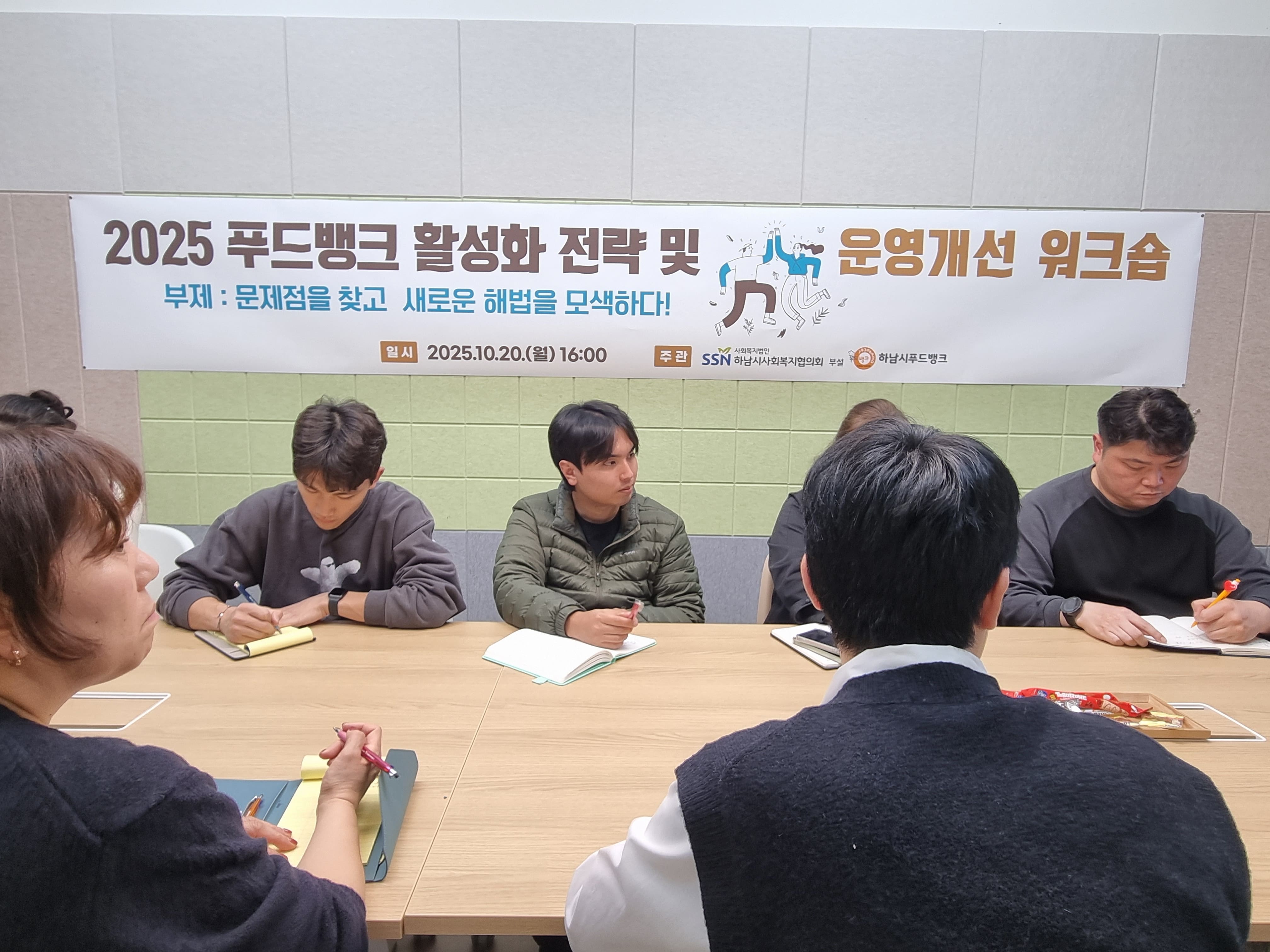 일시: 2025년 10월 20일 (월) 장소: 하남시사회복지협의실 참석자: 하남시푸드뱅크 및 하남시사회복지협의회 종사자 내용: 푸드뱅크 우수사례를 공유하면서 하남시푸드뱅크의 문제점을 진단하고 개선 방안을 마련하는「2025 푸드뱅크 활성화 전략 및 운영개선 워크숍」을 진행하였습니다. |
