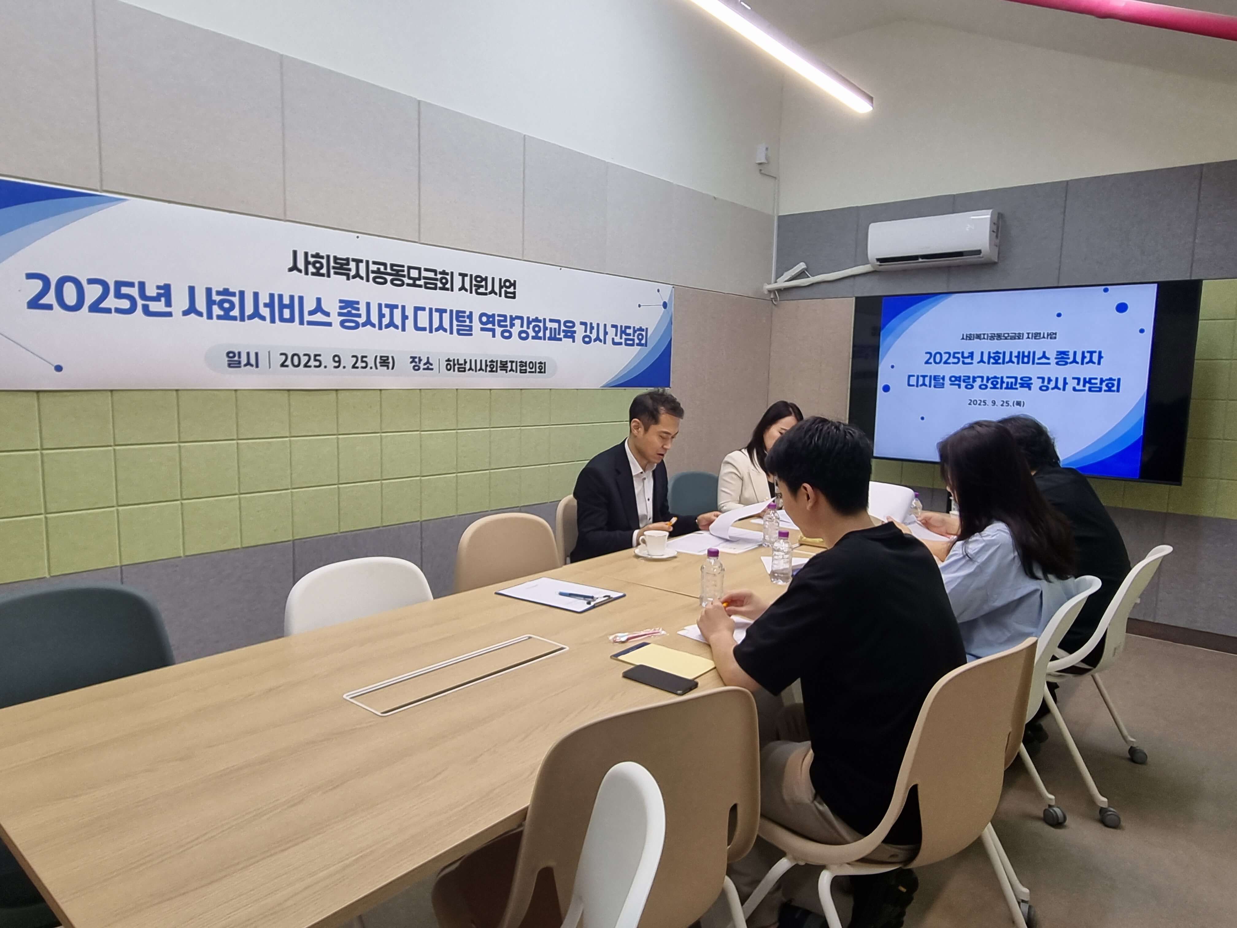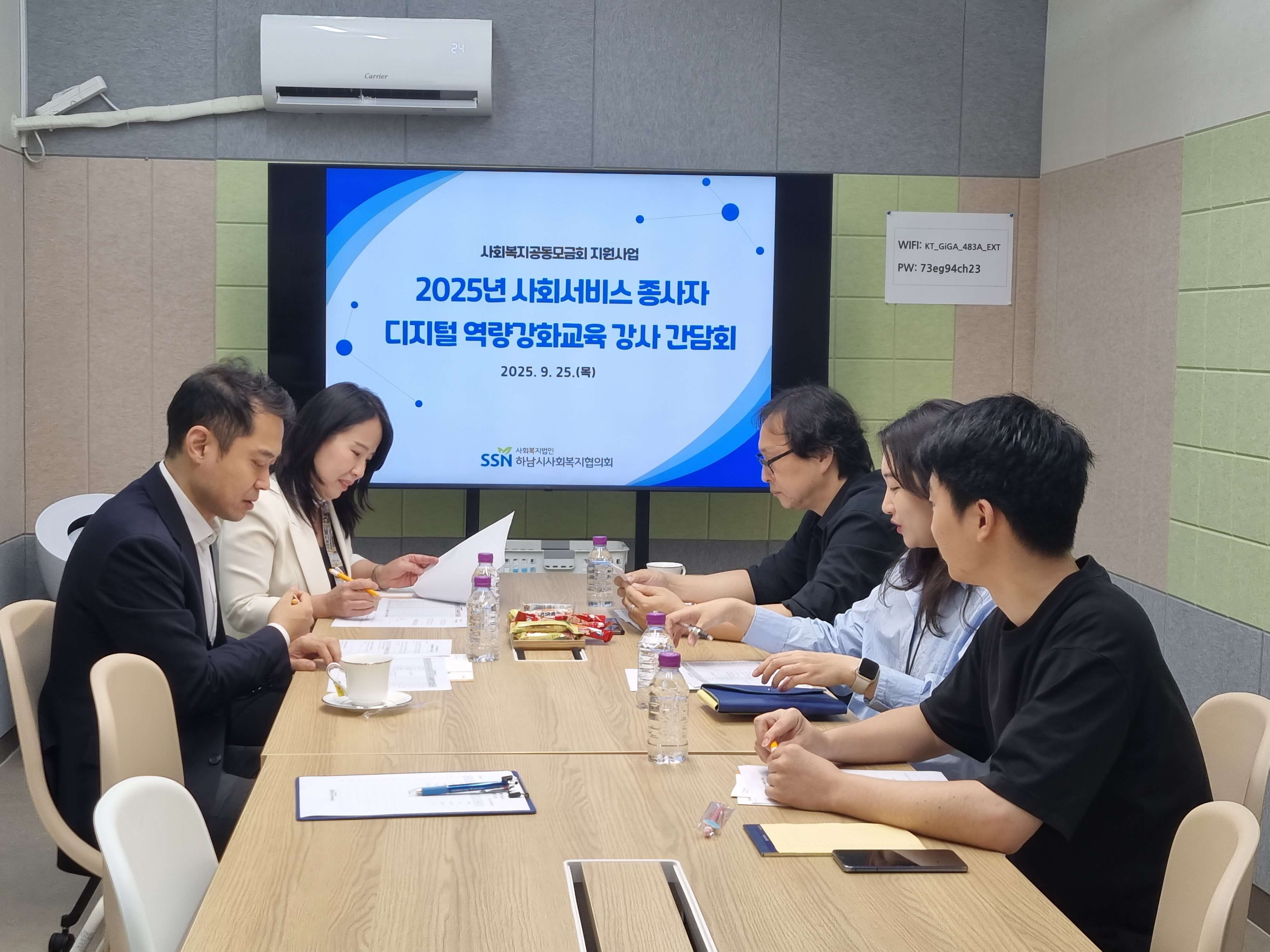 일 자: 2025년 9월 25일(목) 장 소: 하남시사회복지협의회 회의실 참석자: 5명 내 용: 사회복지공동모금회 지원사업인 2025년 사회서비스 종사자 디지털 역량강화교육 강사 간담회를 진행하였습니다. |