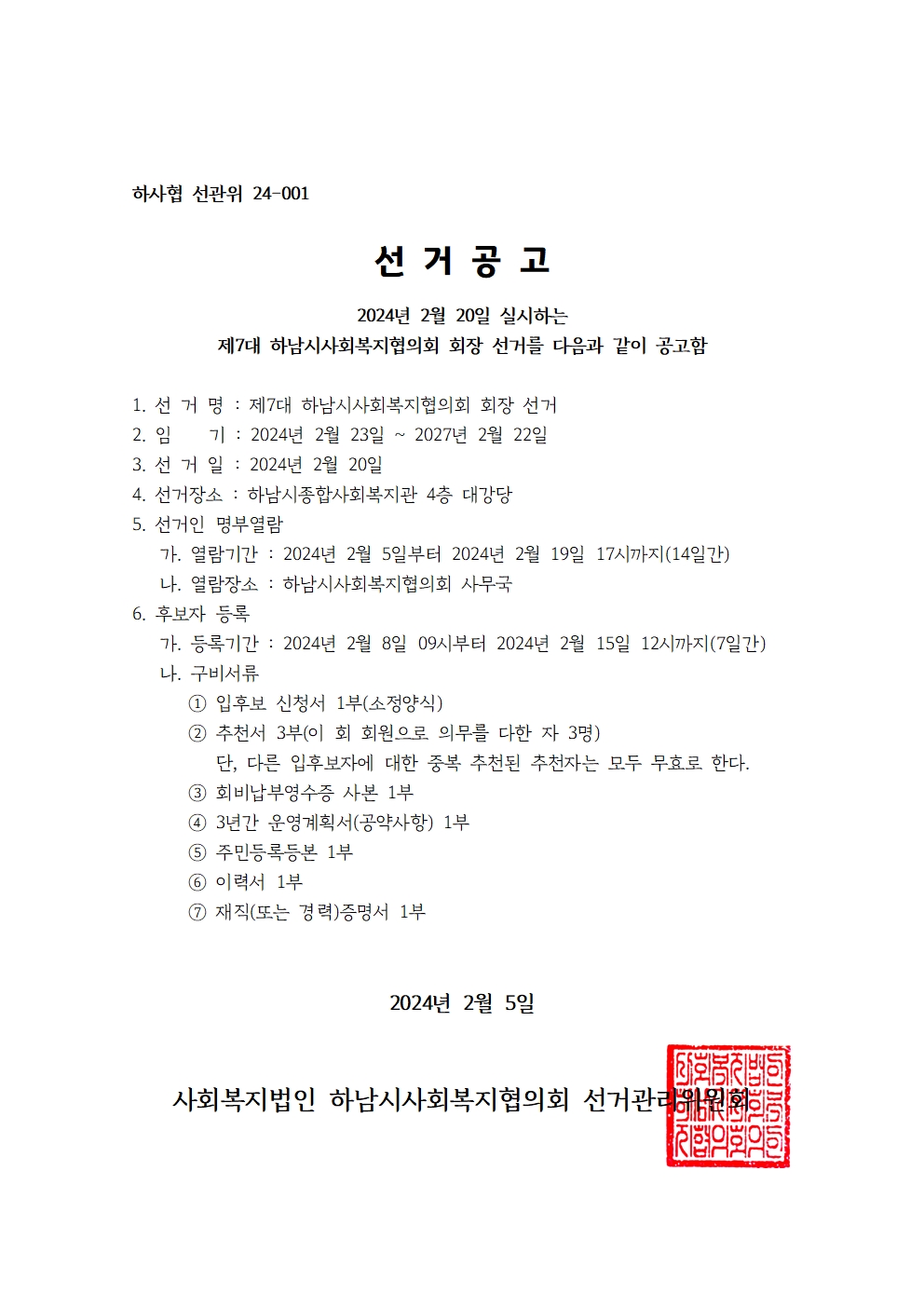 제7대 회장선거 후보자등록 공고 및 운영계획서