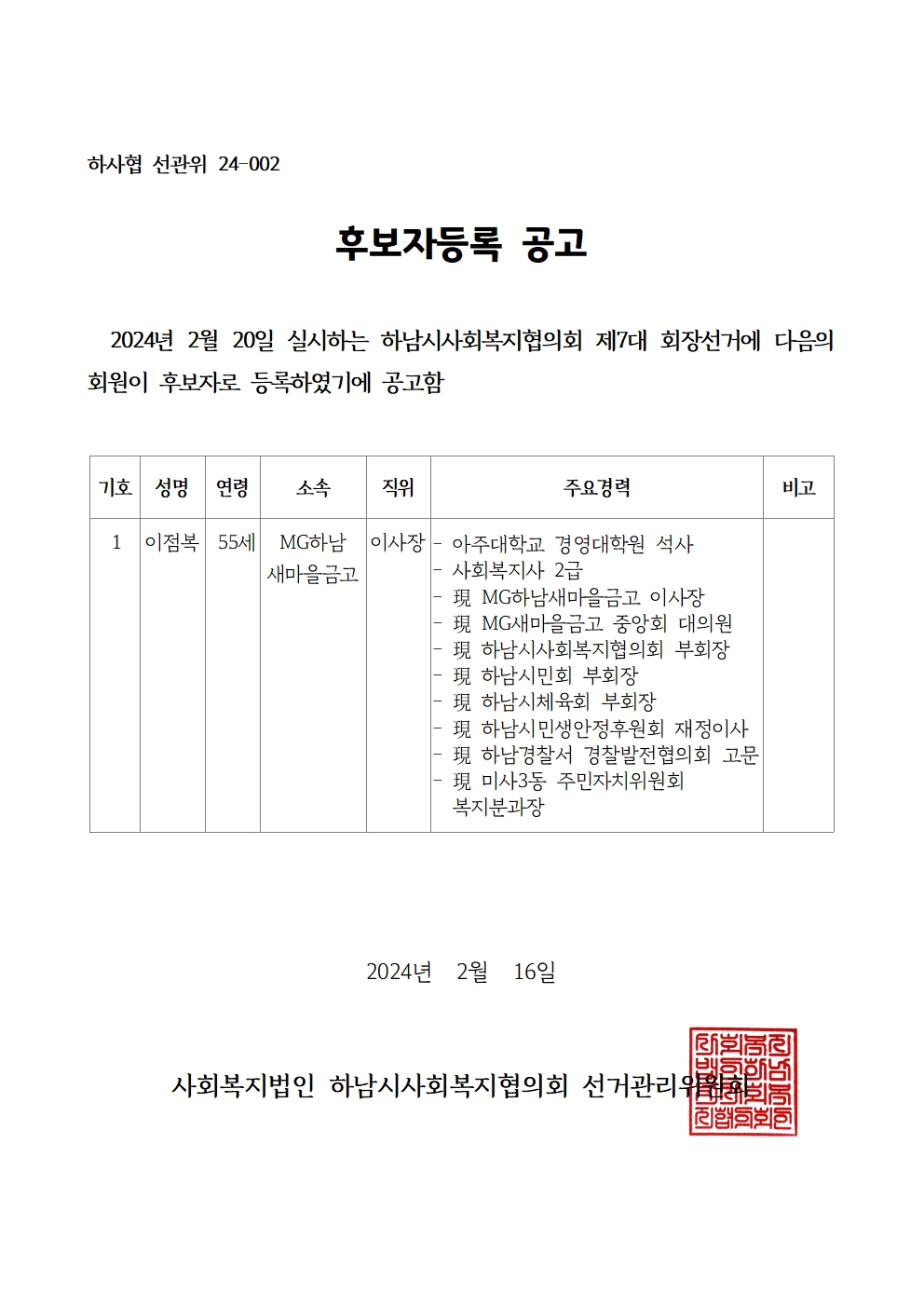 | 제7대 회장선거 후보자등록 공고 및 운영계획서 | |||||